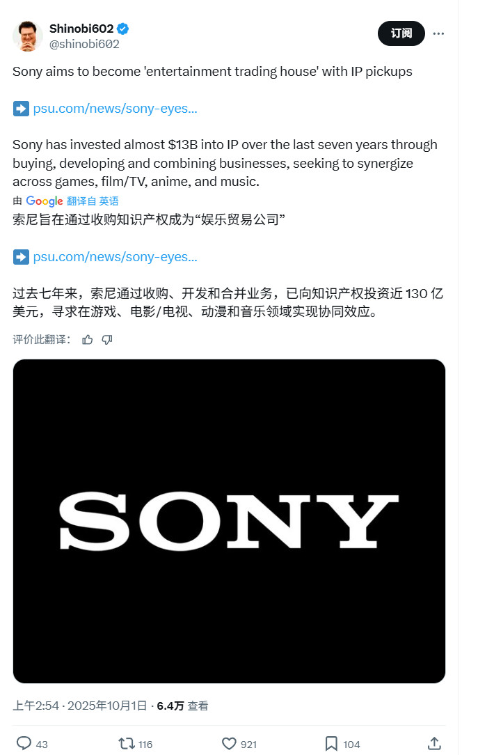 索尼加速IP收购战略,剑指"娱乐综合商社"版图