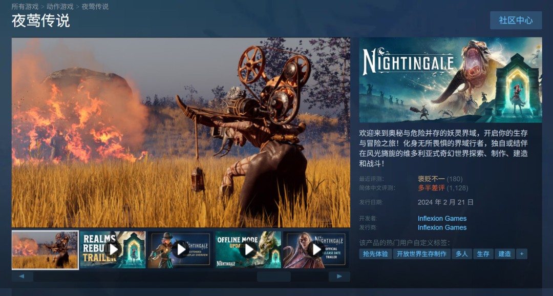 重磅消息!Epic游戏商城本周限时免费福利来了——2024年2月发售的开放世界生存建造大作《夜莺传说(Nightingale)》现在可以0元入库!原价108元的游戏支持简体中文,领取截止时间为10月9日23点。更让人期待的是,下周还将送出复古风2D平台动作游戏《重力回路(Gravity Circuit)》,10月9日起开放领取。
