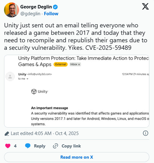 ⚠️ 玩家须知:Unity官方表示目前尚未发现漏洞被利用的情况,玩家数据暂时安全。他们已经推出修复补丁,建议大家关注自己常玩游戏的最新公告。