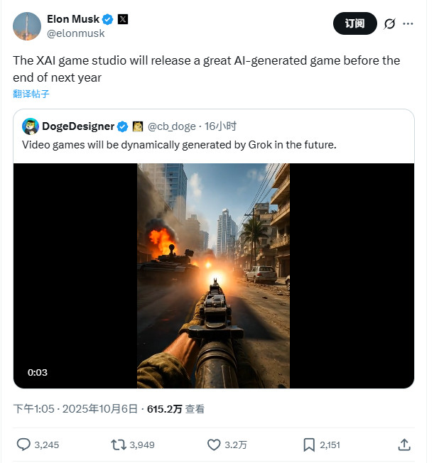 马斯克进军游戏界!xAI将推出首款完全由AI生成的3A级游戏