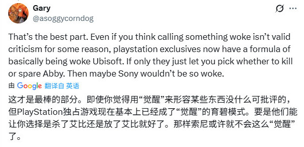 网友:“现在的索尼简直就是育碧2.0,觉醒的代名词。要是当初《最后生还者2》里能给玩家选择是否击杀艾比,都不至于这么‘觉醒’。”