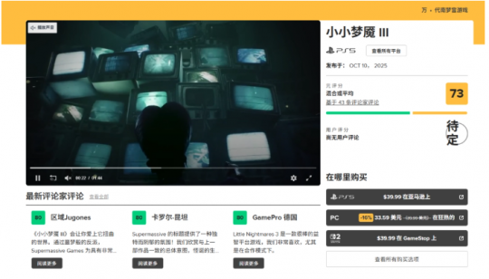 《小小梦魇3》终于要在10月10日正式发售了!最近媒体评分也陆续解禁,不过开局似乎不太理想——目前Metacritic均分73,收录43家媒体。其中IGN只给了6分,直言游戏缺乏挑战、流程略显单调,让人有点小失望。