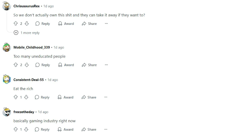 "这简直就是数字时代游戏所有权的危机写照。我们花钱买游戏,到头来却什么都不真正拥有。"