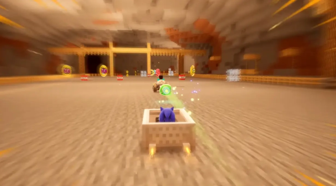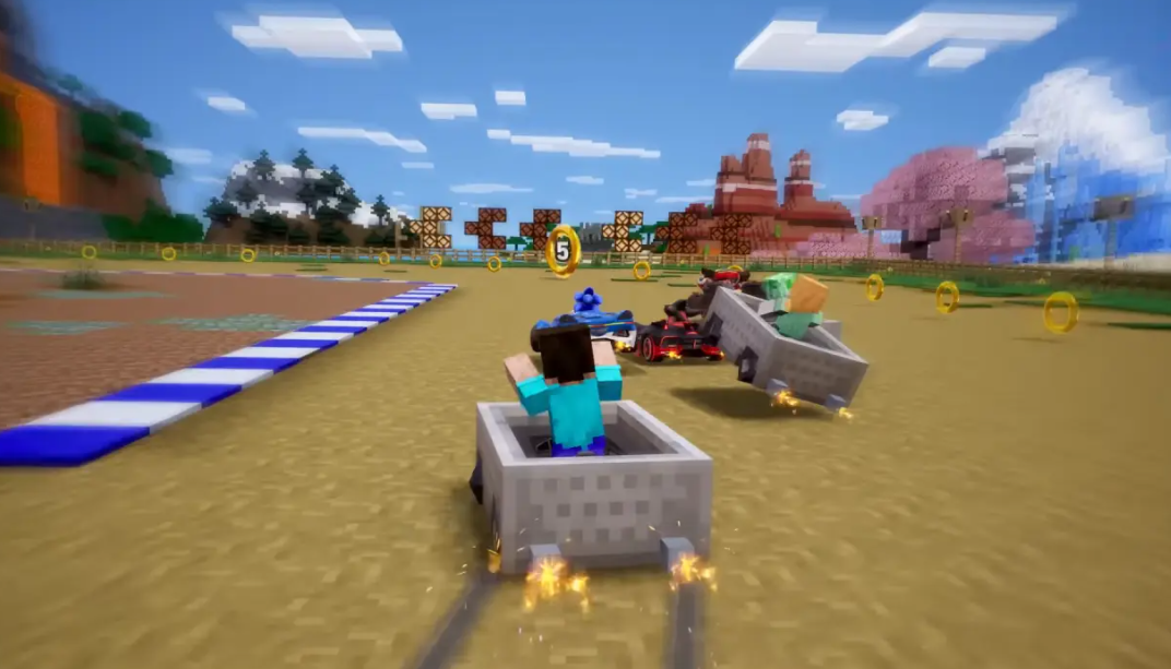 本次推出的DLC为付费内容,不仅加入了三位新角色,还专门打造了以《我的世界》为主题的专属赛道“MINECRAFT WORLD”和“矿车”造型赛车!玩家将驾驶标志性的方块风格载具,在充满像素元素的世界中体验全新竞速乐趣。
