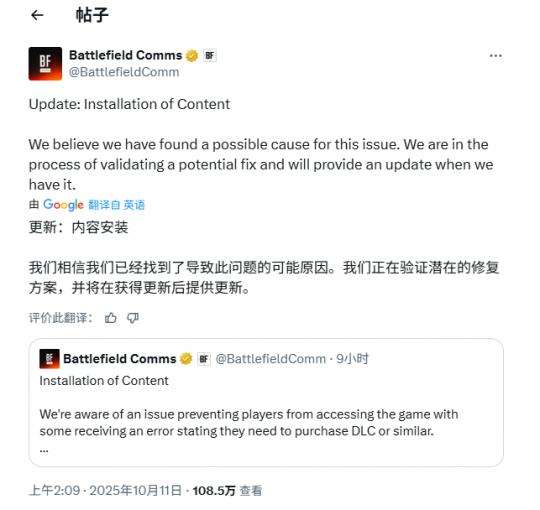 《战地》官方通讯账号随后发布回应:“我们已知晓部分玩家在启动游戏时遇到需购买DLC或类似的提示,团队正在积极调查,后续将发布更新。感谢大家的耐心。”——经典“我知道了正在修”模板,但到底什么时候修好?没人知道。