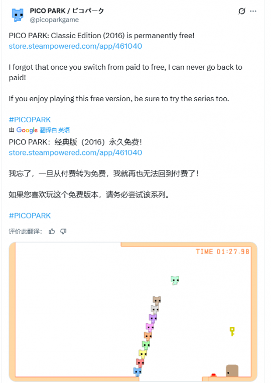最近游戏圈发生了一件趣事!知名多人合作解谜游戏《Pico Park》的开发者闹了个"美丽的误会"——原本只想搞个限时免费活动,结果手滑把2016年发行的《Pico Park:经典版》永久免费了!这波操作直接让Steam玩家喜提"真香"福利。