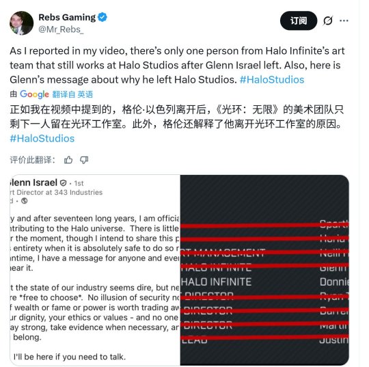 巧合的是,就在同日,外媒爆料称效力Xbox长达17年的《光环》资深美术总监 Glenn Israel 也“愤然离职”,并在社交媒体上暗示工作室内部存在文化冲突,引发玩家社区广泛猜测。