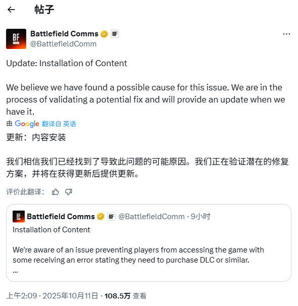 《战地》官方通讯账号随后发表回应:“我们注意到部分玩家在尝试进入游戏时,会出现需要购买DLC或类似的提示,团队正在积极调查这一问题,后续将发布更新。感谢大家的耐心。”不过,EA目前还没有给出修复的时间表。