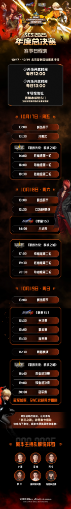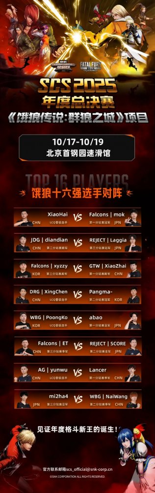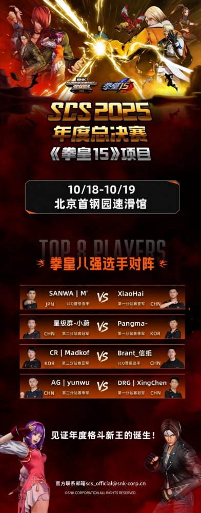 格斗游戏爱好者们注意了!SNK冠军系列赛2025年度总决赛(SCS 2025)即将于10月17日至19日在北京首钢园热血开战!本届赛事将决出《拳皇15》和《饿狼传说:群狼之城》两大项目的年度总冠军,并直接揭晓SWC 2025的晋级名额,堪称今年最不能错过的格斗盛宴!