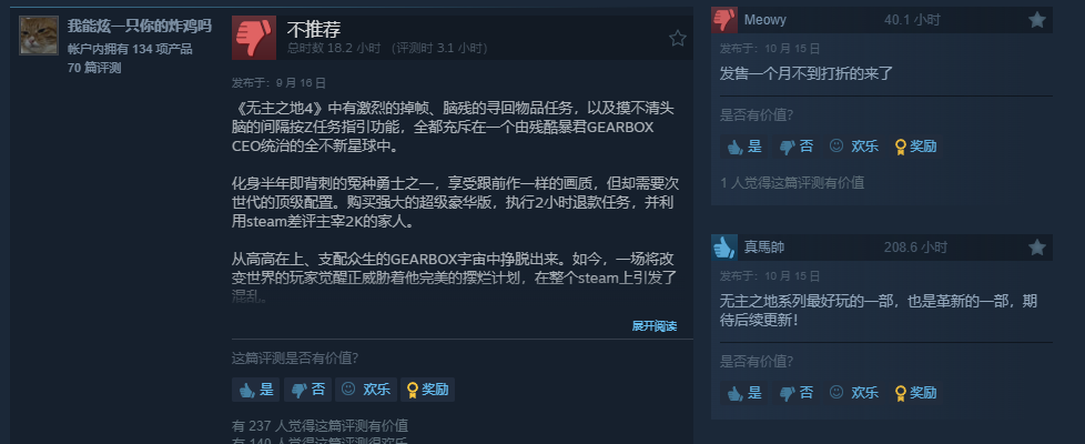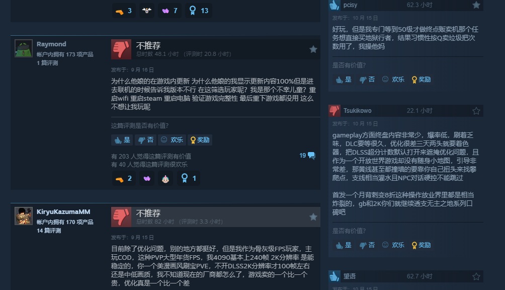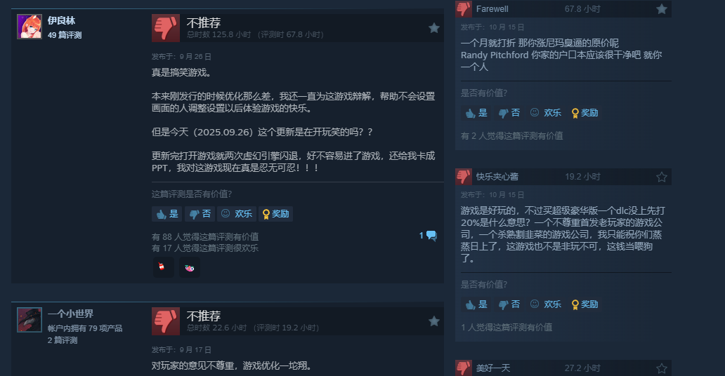 游戏目前在Steam评价褒贬不一,全球好评率61%,而国区好评率更是低至37%。不少玩家吐槽优化烂、Bug多,再加上首发一个月就打折,评论区已经成了大型吐槽现场。