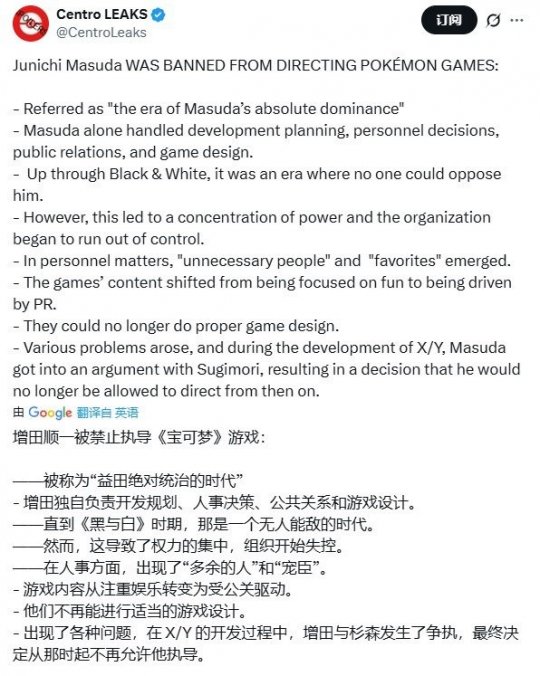 这次泄露事件的核心源头Centro Leaks,放出一批据称来自Game Freak内部的开发文档,清楚说明了增田顺一是如何在《X/Y》开发期间“被下课”的。从他一手主导从《金/银》到《黑/白》八代正作的辉煌时代,到突然失去主线掌控权——这一切背后,竟源于他与另一位元老杉森建的激烈冲突。