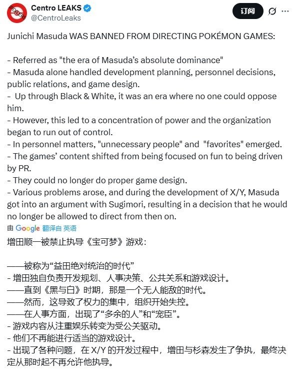 泄露内容描述那段时期为“增田绝对主导时代”,几乎所有关键决策都由他一人拍板,团队几无反驳空间。而这一切,在《X/Y》开发中与另一位元老杉森建的激烈冲突后彻底爆发,导致增田被禁止再担任主线作品的导演。