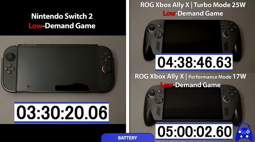 - 低负载游戏:Switch 2约3.5小时 / Ally X(25W模式)约4.38小时 / Ally X(17W模式)约5.02小时