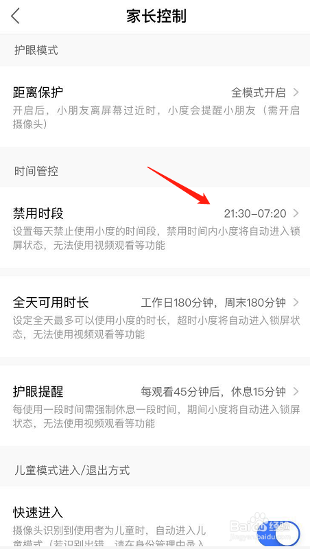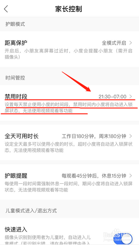 正文 小度app禁用时间段设置方法 访客 V游客 /10-18/5.44 K阅读/0评论 1018 1、下载小度,点击登入小度2、登入小度后,点击家长控制3、打开家长控制后,点击禁用时段4、打开禁用时段后,根据自己需要设置启用和结束禁用时间5、小编启用禁用时间为21:30,结束禁用时间为7:006、设置后,返回即可,禁用时间内小度将自动进入锁屏状态,无法使用视频观看等功能