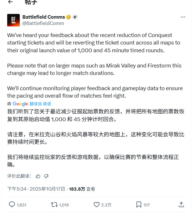 10月15日,《战地6》开发团队突然宣布将对游戏内最受欢迎的模式——征服(Conquest)进行大幅调整,计划削减初始票数以缩短单局时长。没想到,这一改几乎引爆了整个《战地》社区,反对声如潮水般涌来。令人惊讶的是,仅仅48小时后,EA就火速撤回了这项决定,宣布征服模式将重回1000票数与45分钟时长,并承诺将持续优化游戏体验。