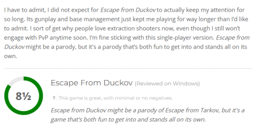 令人惊喜的是,《逃离鸭科夫》居然让我一玩就停不下来!出色的枪械手感与深度的基地建设系统让我不知不觉就投入了数十个小时。现在我总算明白撤离射击游戏的魅力了——虽然暂时还不敢碰PVP,但这个单人版本已经足够让我沉迷。它表面看似整活,实则构建了一套完整且自洽的玩法逻辑,既欢乐又硬核,堪称独树一帜。