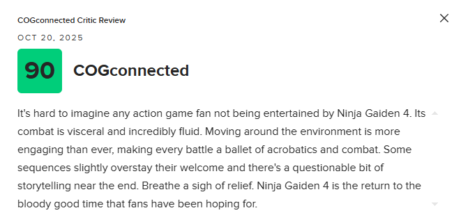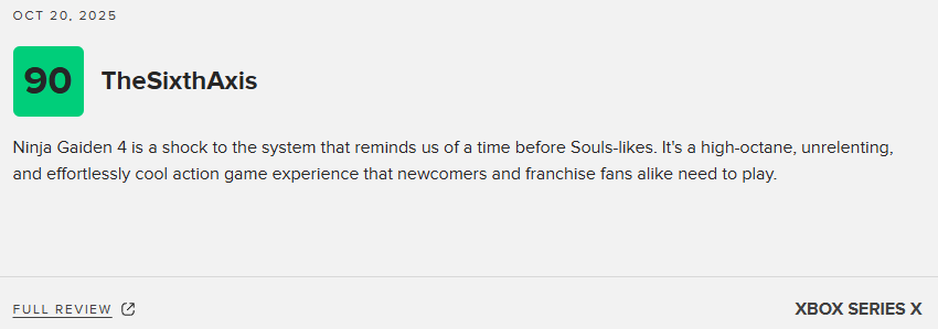 万众期待的动作游戏经典回归!由Xbox Game Studios发行,白金工作室与Team NINJA联手打造的《忍者龙剑传4》现已正式发售,各大媒体评分同步解禁——目前Xbox版Metacritic均分83分,收录38家媒体评价,整体口碑强劲!