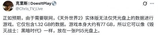 最近一则消息让不少实体游戏玩家直呼“蚌埠住了”——据曝光,即将于10月29日发售的《天外世界2》PS5实体版光盘,实际数据容量仅有1.32GB,而这款由黑曜石工作室开发的RPG大作完整体积却高达77GB!这意味着,哪怕你买了实体盘,插进光驱后仍要额外下载约75GB的内容,光盘几乎成了“启动器”,甚至被不少玩家调侃为“限量版杯垫”或“信仰镇纸”。