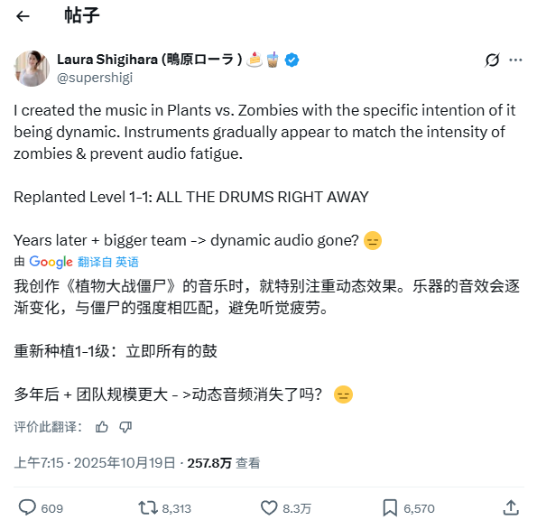 原版配乐师Laura Shigihara在X上发文,直言重植版的音效设计“令人困惑”。她透露,原版音乐采用动态音效设计,会随关卡进度和僵尸强度逐渐加入乐器,以避免玩家听觉疲劳。然而重植版却“一上来就在1-1用上了全鼓组”,完全丢失了这一精巧设计。“多年过去,团队规模更大,技术更强,结果动态音效反而没了?”