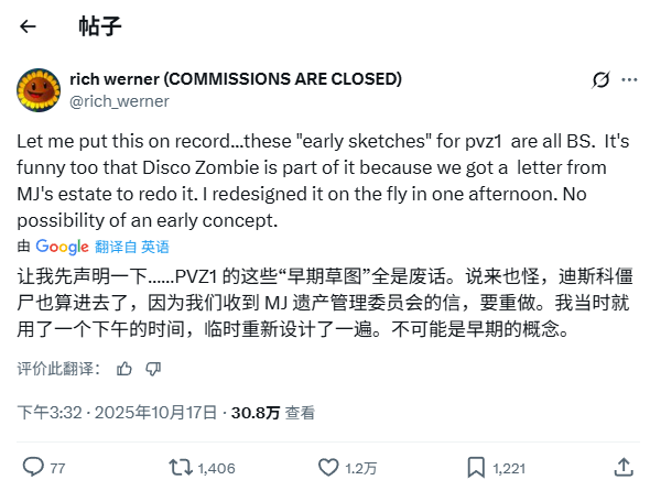这还没完。更令人咋舌的是,原作美术师Rich Werner也站出来指控重植版中展出的所谓“早期概念草图”根本是伪造的。他强调:“我得把话说清楚——那些所谓‘《植物大战僵尸》早期草图’全是胡扯!”
