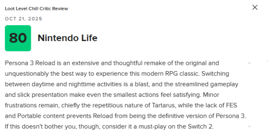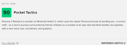 由Atlus开发的经典日式RPG《女神异闻录3:Reload》即将登陆Switch2平台!本作的Switch2版媒体评测现已解禁,截至目前,基于22家媒体评分的均分为79分,表现相当稳健。