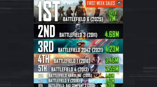 《战地》系列首周销量具体排名如下: