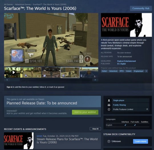 重磅消息!2006年经典游戏《疤面煞星:掌握世界》最近在Steam和Epic平台的重制上架计划彻底翻车了!这款改编自1983年经典黑帮电影《疤面煞星》的游戏,本来准备带着AI技术加持的升级画面回归PC平台,结果没想到搞出了个大乌龙。