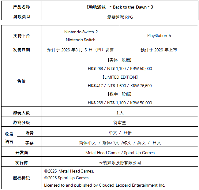 【重磅新作】《动物迷城》NS双平台版定档2026年3月5日!豪华限定版内容首曝