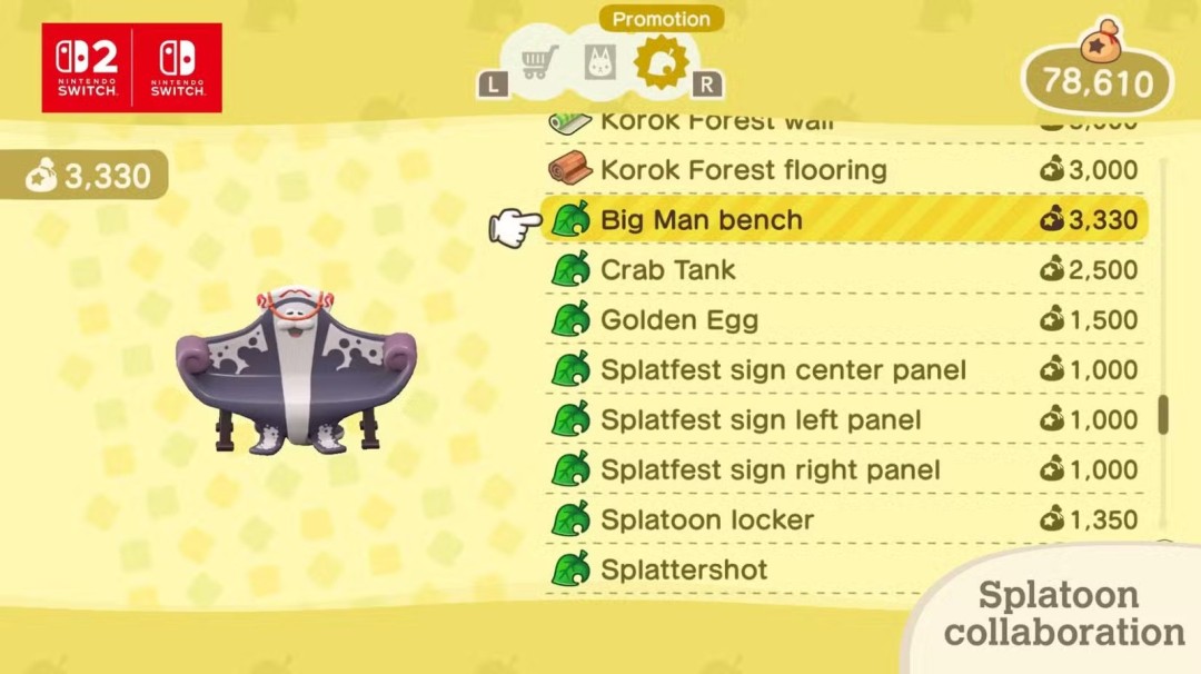 然而在《集合啦!动物森友会》3.0更新中,一个强劲对手正撼动着青蛙椅的王者宝座。随着任天堂突然公布的12分钟更新预告,源自《喷射战士》联动的"曼曼长椅"以3,330铃钱的价格横空出世,其独特的鱿鱼造型和鲜艳配色瞬间俘获了玩家的心。