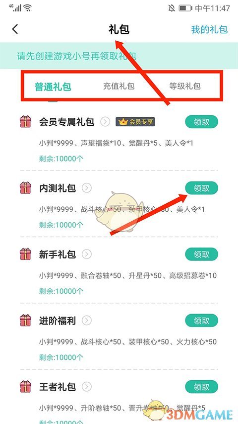 11、在【礼包】界面,可选择“普通礼包”、“充值礼包”、“等级礼包”进行领取,助你游戏更轻松,